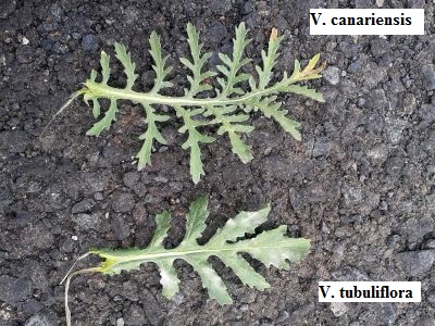 Our plants have white flowers, matching the flowers of V. canariensis, and not the usual purple or violet flowers of V. tubuliflora, and so at first glance appear to be V. canariensis. However, these two species have quite different leaves, and there is little doubt that our plants match the wider less-cut leaves of V. tubuliflora much better than the deeply-cut leaves of V. canariensis, as shown in the following photographs supplied by Chris from one of his contacts in Spain.