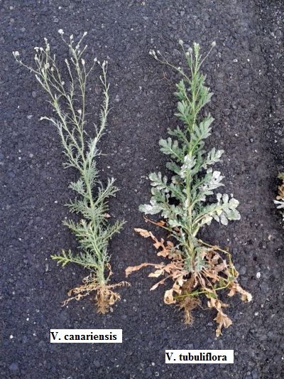 Fig. 2. Comparison of V. canariensis and V. tubuliflora. Click on the pictures for larger versions. Plants identified as V. tubuliflora have already invaded the Atacama Desert Region in Chile, and this species is known to have white flowers in very arid areas of southwestern Morocco. However, the flowers of V. tubuliflora look quite different from the flowers of our plants, and the plants in Chile.