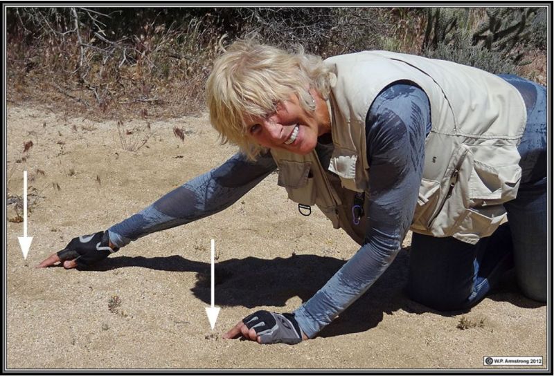 Fig. 1. Top: Two plants of Nemacladus twisselmannii var. botanywomaniae, Botany Woman's Threadplant, amidst typical small sand grains, showing two color variations of the plants. All flowers are in fruit except for the single flower in the picture on the right with the white petals. The flowers and fruit are typically 3 mm in length; these entire plants are just 6 mm (~1/4 inch) tall. The plant we vouchered was among the largest plants, at 13 mm tall and 24 mm wide (1/2 in tall and 1 inch wide). Photos by Keir Morse; see also photos below from 2012; photos from Keir from 2012 and photos from Fred Melgert and Carla Hoegen from 2019. Bottom: Kate Harper, aka Botany Woman, pointing at two clusters of largish plants, also marked by white arrows; photo by Wayne Armstrong.