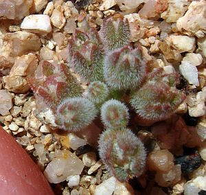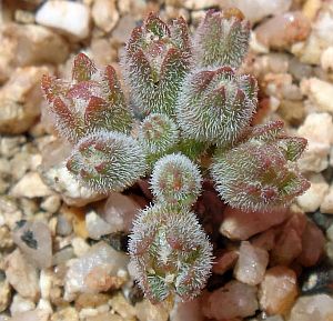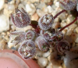 For me the defining characteristics include the really big ovary that seems to be in fruit almost before the flowers have had a chance to do much, the hairs all over the plant (nothing else in Nemacladus has hairs like this), and of course the very compact plant. N. t. shares with N. californicus the rosette producing an axillary stem making another rosette, which is almost never seen in N. t. because the plants rarely get big enough to create another stem. It is fascinating that these axillary stems in your plants have such long internodes, too. The calyx lobes look to be shorter in your plants than in the Pine Flat location.We cannot even imagine how this species could be found in two such different localities separated by 210 miles, unless there are overlooked populations elsewhere. It would be extremely easy to overlook populations of this species, so it is difficult to say that there are not populations elsewhere.