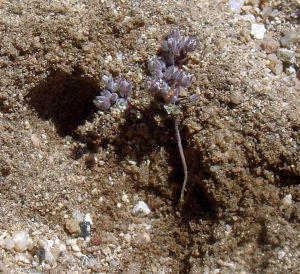 Thirty mostly tiny (even for this species) plants were found in April 2019, which was a very good rainfall year. But there were many very tiny plants of other species growing in the washes with them. These tiny plants probably germinated after the wash had been resurfaced during the normal growing season, which removed plants that had germinated earlier in the year. Plants that germinate late in the growing season usually end up producing just one or a few flowers on very small plants.