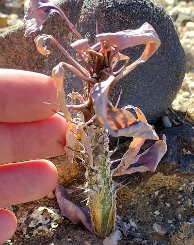 On 18 December 2022, we, along with Jim Roberts, discovered eight first year plants near Ironwood Wash that probably germinated from the remnants of a tropical storm that dropped lots of rain in the desert in September 2022. We followed up those plants on 3 December 2023, and every single one of them had vanished without a trace. We surmised this was due to predation, since if they had died from the summer heat and lack of rain, there probably would have been remnants left. This is consistent with the findings of Bowers, Turner and Burgess 2002 that predation is a more frequent mortality source than drought.
