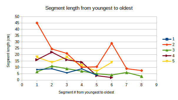 Fig. 4. Stem segment length vs. segment number. The youngest stem segment is given as segment #1, with subsequent segments as #2, #3, etc. The last stem segment is the one at the base of the plant.