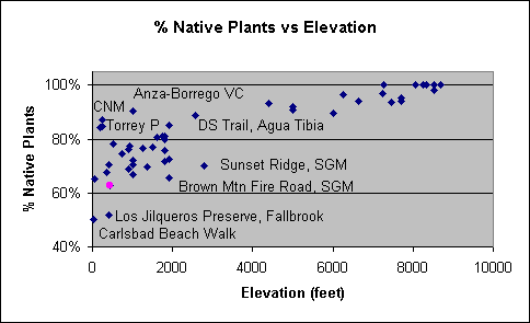 It is interesting to note that the percentage of native taxa, adjusted for elevation, is still significantly higher than two low-elevation portions of the San Gabriel Mountains, the Brown Mountain Fire Road and the Sunset Ridge Trail.