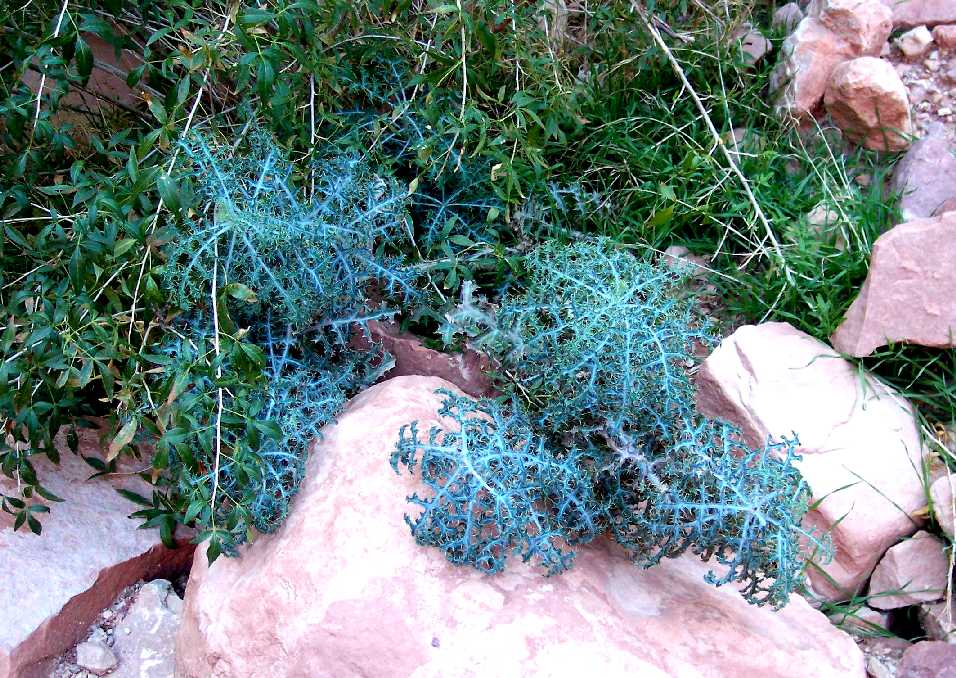 I suspect the usual explanation for such a difference probably applies here. This species is a Grand Canyon endemic, and there are only nine vouchers of this species online, all from Roaring Springs Canyon or nearby except the Bright Angel Trail area voucher. Rare species are rarely described fully due to the paucity of vouchers, so the mismatch on the habitat doesn't bother me in the least. It is also possible that most of the plants farther upstream are growing on steep slopes, and the two specimens in the drainage are growing in atypical locations for this species, from seeds or plants that were deposited in the wash. This species is probably vouchered less often than an average species, since I wouldn't even want to touch this seriously-prickly plant, let alone try to get a voucher sample and then try to press it.