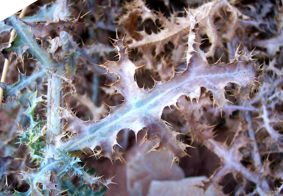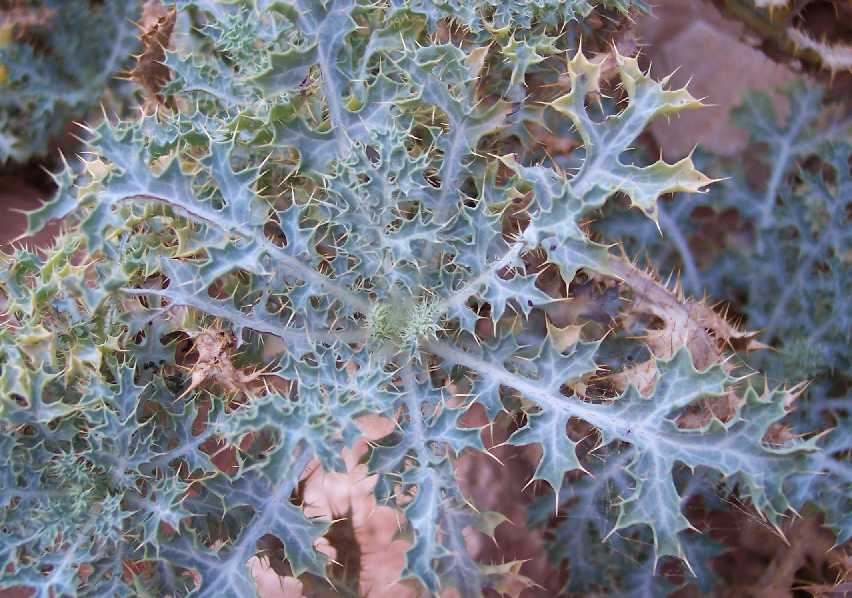 My pictures below clearly show that the leaves are lobed nearly to the midrib, the lobes are narrow, and the leaves are prickly only on the veins. Thus all three of his distinguishing characteristics that I can measure on my pictures go to A. arizonica. (I observed decumbent stems, again consistent with A. arizonica, but they are old stems and I cannot rule out that they were erect when they were in bloom.)