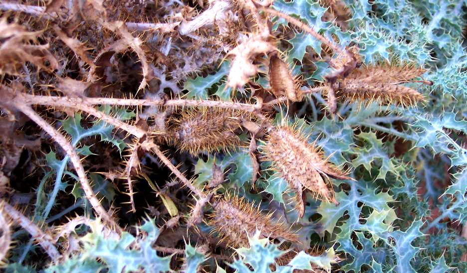 Furthermore, assuming that my photographed specimens are indeed Argemone, they key to A. arizonica in the Flora of North America key as well as in the 1999 Flora of Arizona Argemone treatment. Those keys use some of the McDougall differences, plus one additional discriminant: A. munita has main lobes of leaves generally rounded at the apex, which once again does not fit the plants in my pictures; my plants have distinctly non-rounded lobes.