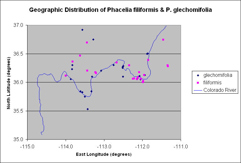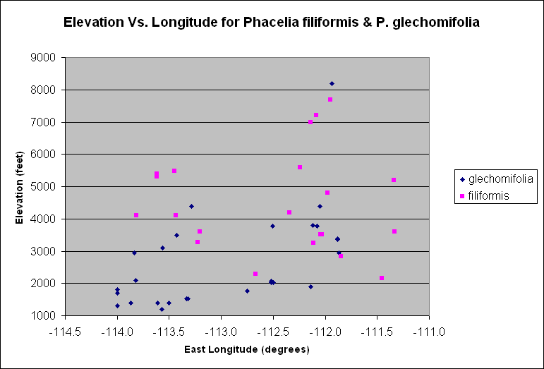 Kearney and Peebles give the elevation range for P. filiformis as 3000 to 7500 feet; for P. glechomifolia as 4000 or lower, which is a good summary of most of the points in the above plot.
