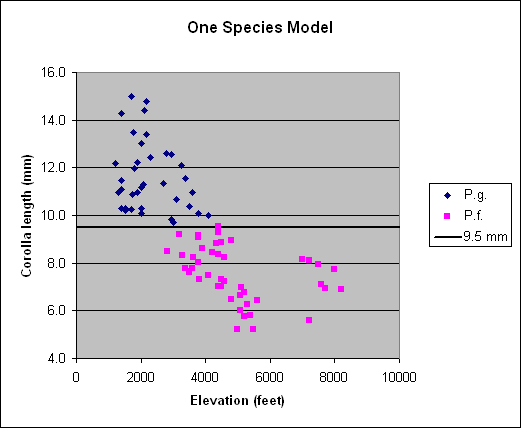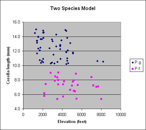 The plot above is precisely what one would expect if one made an arbitrary cut in corolla length for a single species whose corolla became smaller with elevation. All low elevation plants would be one of those species; all high elevation plants would be the other. The two "species" would interfinger at intermediate elevations depending on growing conditions for each plant.