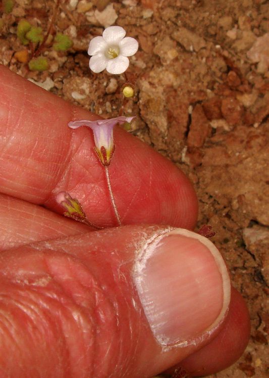 11'. Corolla 10 to 15 (exceptionally only 9) mm long; ovules 35 or more ... P. glechomifoliaI didn't measure any corollas in the field, but I have three photographs with my fingers for scale that can be used to measure the corollas. Measurements on close-up photographs require care, since the scale is usually not at the same distance from the camera lens as the object. Fortunately, in two of the three photographs, I have a finger both in front of and behind the corolla, and hence can get a fairly good measurement. In the third photograph, a portion of my finger is about at the same distance.
