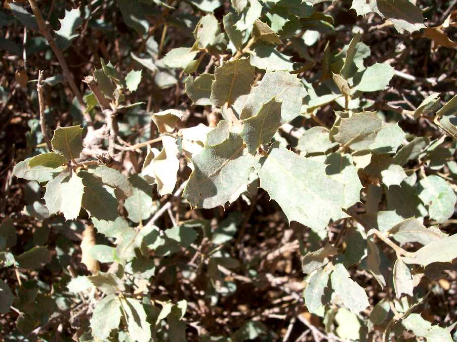Identifying oaks in the Grand Canyon is a piece of cake compared to identifying oaks in California. If you see an oak at the Grand Canyon with leaves that don't have any significant lobes and that have many spiny-tipped teeth, you're looking at shrub live oak, Quercus turbinella.