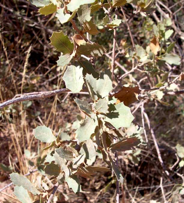 1a. Leaves lobed (2) 1b. Leaves not lobed (3) 2a. Leaves deeply lobed, the lobes rounded without a spiny tip.... Q. gambelii 2b. Leaves rather shallowly lobed, each lobe with a spiny tip ... Q. undulata 3a. Leaves entire or with a very few teeth... Q. grisea 3b. Leaves with many spiny-tipped teeth... Q. turbinellaQ. undulata is not given as a taxon in the Flora of North America treatment, since it is thought to be a complex of hybrids of Q. gambelii with whatever scrub oak is found in its vicinity. In the Grand Canyon, the scrub oak parent is thought to be Q. turbinella.
