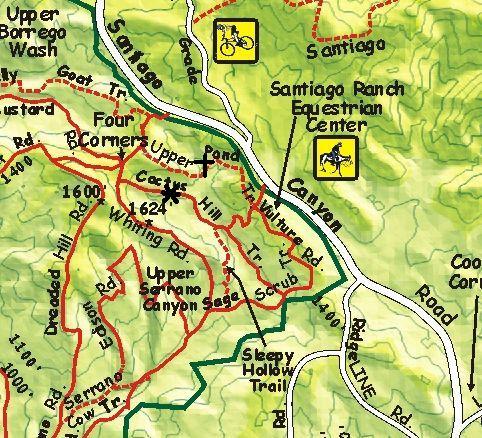 The attacks were on the Cactus Hill Trail between the Water Tank and the Pond; the location is marked with a black asterisk. The cougar was killed about halfway between there and Santiago Canyon Road; the location is marked with a black cross.