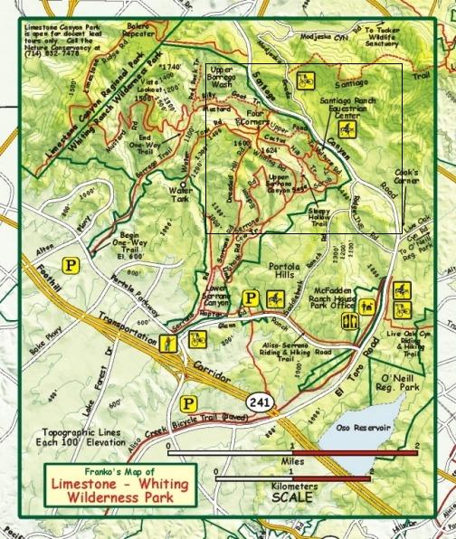 The map on the left shows Whiting Ranch Wilderness Park. The area outlined with a black rectangle is shown at higher resolution on the right.