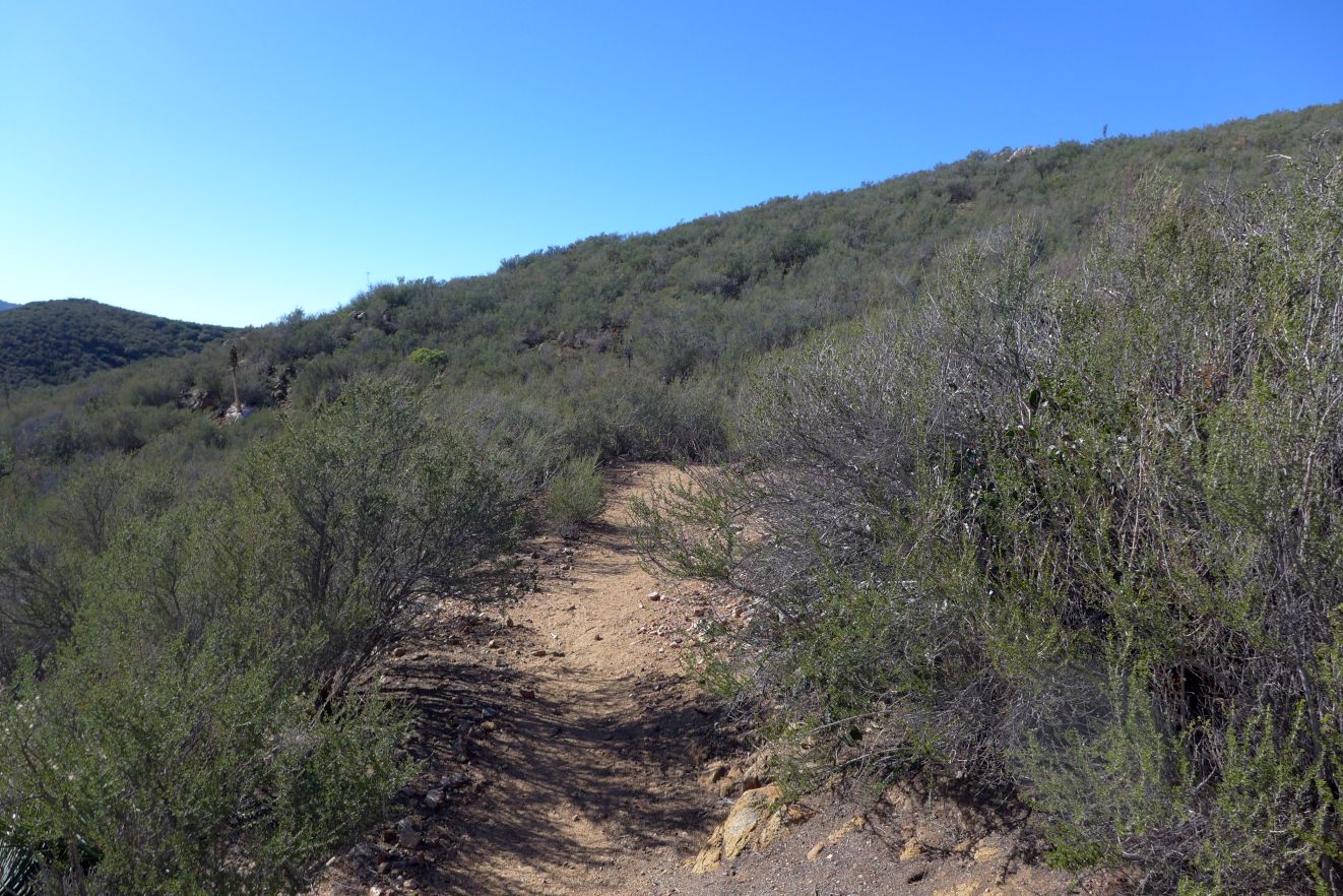 The trail begins in open Borrego Desert vegetation, and gradually transitions to desert chaparral for most of its length. Just before the high point on the trail, chamise chaparral appears, which becomes dense past the high point (Fig. 3). The vegetation at the beginning and end of this segment is completely different (compare Figs. 2 and 3).