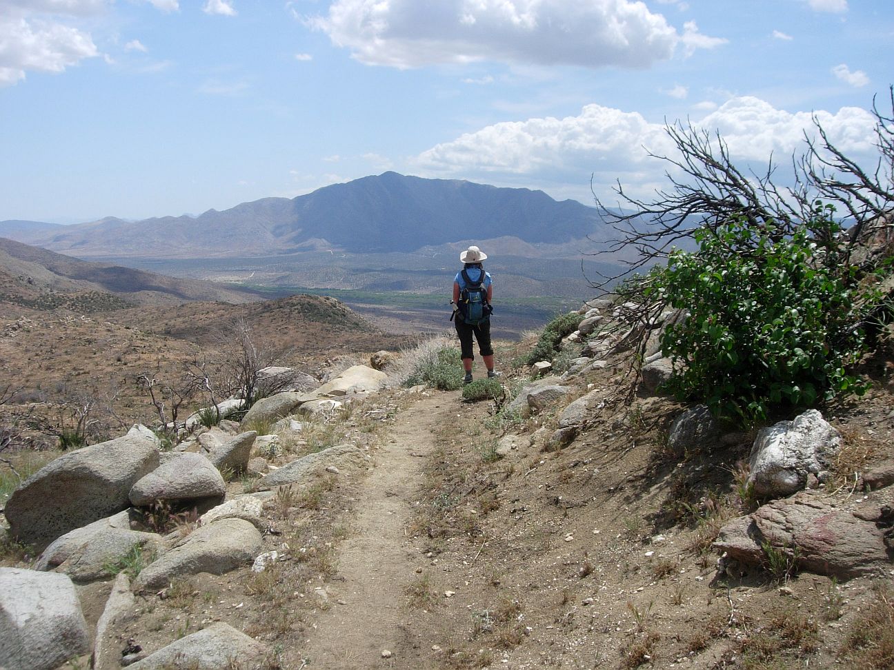 Click on the picture for a full camera frame taken just to the left of this photograph, looking down to Scissors Crossing.You may wonder how it is that the Pacific Crest Trail is passing through a low-elevation desert area. There are two reasons. First, the trail really should be located 10 miles to the west, following the crest of the Volcan Mountains, as mandated by the original Congressional authorization for the PCT. However, it was difficult to gain access to that area, which is mostly private property, so the Forest Service located the trail in mostly-public lands here.