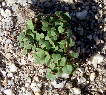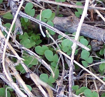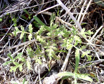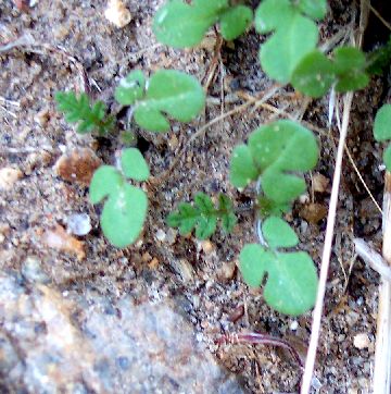 Tentative identifications are given for the seedlings in each column. I'm fairly confident of the determination of Phacelia distans, since I photographed it at known locations of this species on the Borrego Palm Canyon Trail. Also, Erodium cicutarium and Brassica tournefortii have distinctive cotyledons and leaves. The other tentative identifications are less certain.