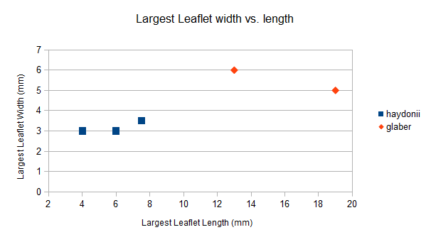 Fig. 4. Plot of leaf width vs. length for the largest leaf I could find on each plant.These plants do not show the difference given in the floras for the number of flowers per node, nor for the longest fruit length on the plant. Fig. 5 shows that contrary to the Jepson Manual key, the largest fruit was found for plants corresponding to A. haydonii, not to A. glaber. Although there is a tendency for the number of flowers per node to be smaller for A. haydonii, only two of the plants have the advertised one to two flowers per node, with the third plant having a median of three flowers per node. However, note that this is a selection effect for the plot, since I intentionally selected that unusual plant to measure in this set. Such large values are almost surely outliers.