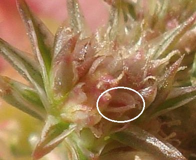 6'. Plant glandular-hairy especially on bracts; outer perianth parts obtuse to ± notched, mucronate ... A. watsonii7. Petals overlapping, spoon-shaped to obovate, widest near tip, with tips rounded to notched below the minute bristle tip ... A. retroflexus