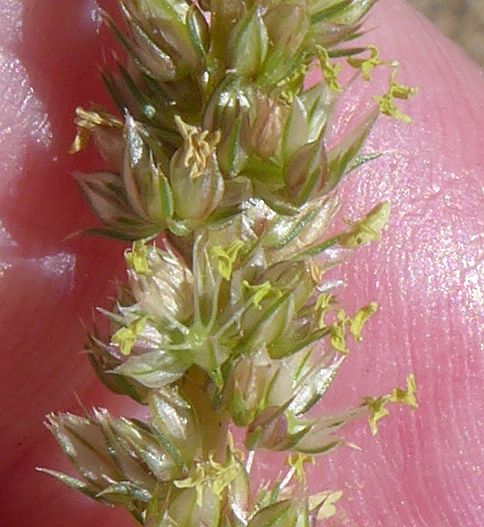 Fig. 2. An inflorescence of a male plant of A. palmeri. Note that every flower has exserted yellow anthers, and that the anthers have four chambers, appearing four-lobed, in the shape of a cross when viewed from above their tip. All Amaranthus anthers are four-chambered. Click on the picture for a larger version.