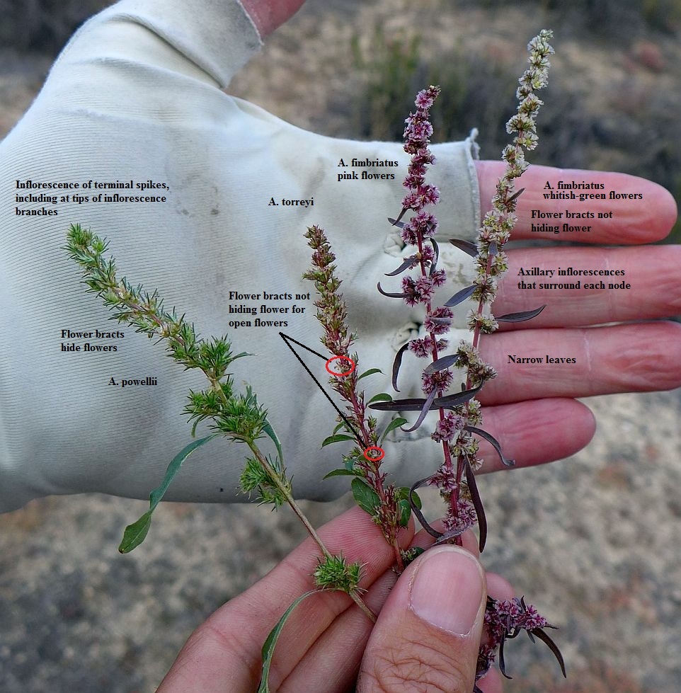 If you find at least one male flower at an inflorescence branch tip, then you know you have one of the other three species, and not a female plant of A. palmeri. However, if you do not find a male flower, it is hard to know if it was just hard to find one, and they do exist, or if they really do not exist. For example, we had to search hard to find male flowers on A. torreyi; this picture appears to show no male flowers; we had to search lower nodes to find a single male flower with fresh anthers (Keir Morse photo). With another sample, we had to dissect the upper flowers to find the anther remnants, since the male flowers were no longer in bloom.