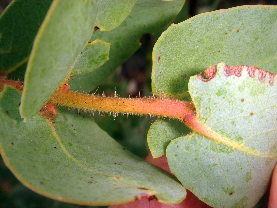 The second hybrid is not obvious at a glance. It was only discovered when Tom systematically checked each of the plants for stem hairs. This plant has stem hairs that are roughly halfway as long as those of the first hybrid. Interestingly, this second hybrid is the only one that shows evidence of burl formation. After we discovered these differences, we then could see that there was a subtle difference in leaf color as well, with leaves slightly greener than those of the pure A. glauca plants.