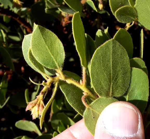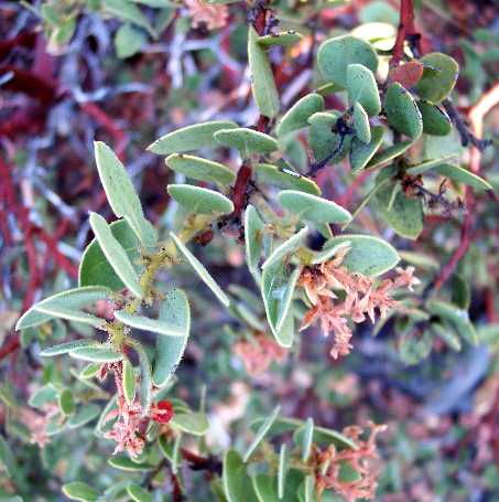 The above pictures nicely show the growth habit of manzanitas in general, and why the twigs and even larger stems have a zig-zag growth habit. The stem lengthens from the uppermost axillary bud, which curves upward and soon makes the former terminal inflorescence appear as an axillary inflorescence.