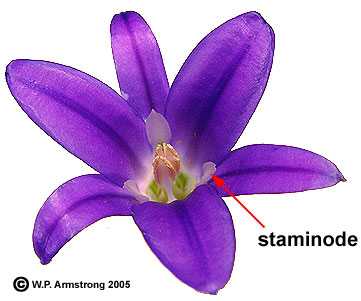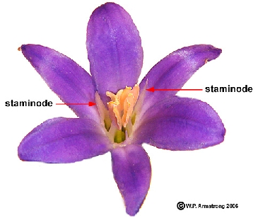 A staminode is a structure similar to a stamen, but that lacks anthers. The staminodes are indicated in several of the following pictures.