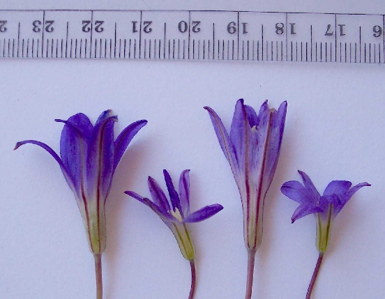 The species also separate into two groups of flower size. B. elegans, B. santarosae, and B. terrestris ssp. kernensis have flowers typically 30-45% larger than the flowers of B. filifolia and B. orcuttii. The photograph below shows our first sampling of populations of B. filifolia and B. santarosae, before we had any idea what species our samples of B. santarosae actually were. The two large flowers are B. santarosae; the two small flowers are B. filifolia. (The sampling was geographically-based; these four flowers are representative of the collected flowers.)