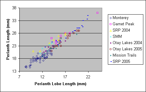 The ovary and style length correspond closely with the difference in perianth length. The Monterey County plants have a very clear separation from the Southern California plants in the style length, and are also separated in ovary length from all Southern California plants except the Mission Trails plants: