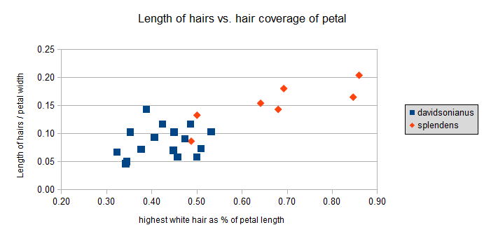 Fig. 4. Plot of the hair length, normalized by the petal width, vs. how far up the petal the hairs are present.Fig. 4 shows quite good separation between the two species as well for the vast majority of the measured flowers. Two of the C. splendens flowers that were clearly separated by species in Fig. 3 now overlap in both characteristics with the most extreme flowers of C. davidsonianus. This may be an artifact of measuring photographs at different orientations, or it may simply mean that these are "generally" good separating characteristics, and not 100% reliable.