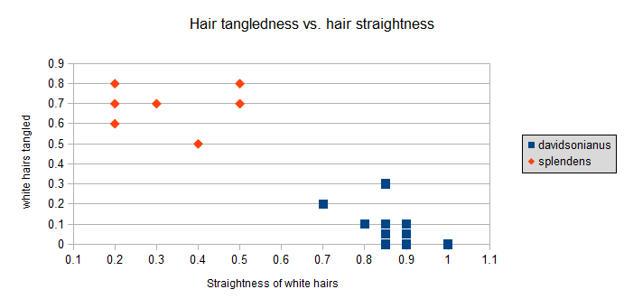 Fig. 3. Plot of how tangled the hairs are (0 represents hairs that aren't tangled at all; 1 represents hairs completely entangled) vs. the straightness of the hairs (0 represents hairs that are completely curly; 1 represents hairs that are dead straight).Fig. 3 shows that you don't need a PCA to discriminate these two species; a simple glance at a photograph to check on the hairs will suffice.