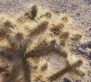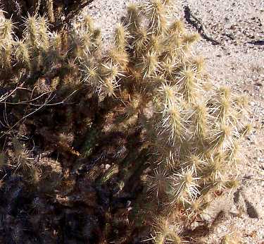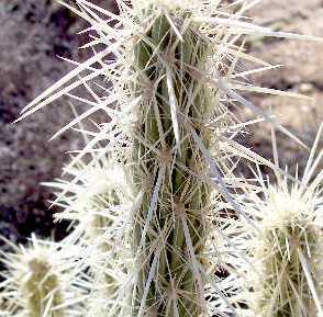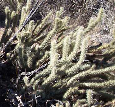 Species Distinguishing Characteristics O. parryi Green stems and tubercles very visible, spines generally not prominent O. ganderi Spines prominent on upper stems, hiding stems and tubercles; upper stems erect and parallel, "reaching for the sky" O. wolfii Spines prominent on upper stems, hiding stems and tubercles; upper stems ascending but mostly not parallel and erect O. echinocarpa Spines prominent on upper stems, hiding stems and tubercles; branches spreading, with many at right angles to main stems See also the formal key for all cholla species in Anza-Borrego Desert State Park.