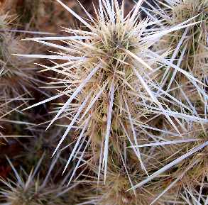 Pictorial Guide Showing How To Identify These Species All of these species have fruit which are moderately to densely spiny, in contrast to the spineless fruit of the teddy-bear cacti (O. bigelovii, O. fosbergii). You can almost always find fruit present on the plant somewhere, either at the tips of the stems or tangled amidst the spines below.
