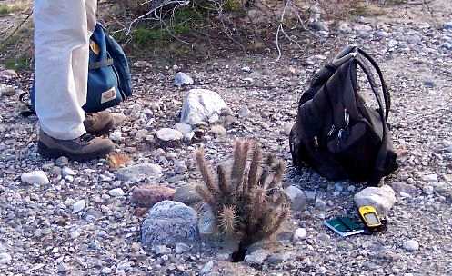 On 21 January 2008, the three authors, Tom Chester, Wayne Armstrong and Bill Sullivan), searched for specimens in the field that could correspond to Gander's voucher. We found candidates only in one area, on an old north-facing bajada (alluvial fan) which is being dissected by the current drainage system. (See trip report.)