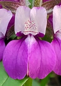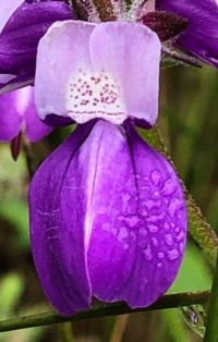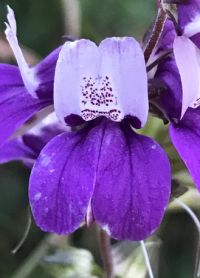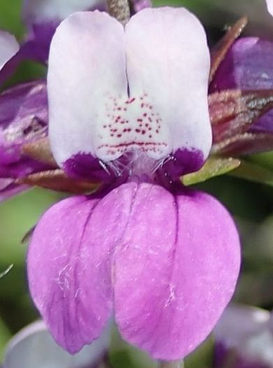 Fig. 2. Side view of a flower of Collinsia concolor (left) and C. heterophylla (right). Top row. Left: Unlabeled pix from an iNat observation of C. concolor by Jason Schock. Right: Unabeled pix from an iNat observation of C. heterophylla by Don Rideout.