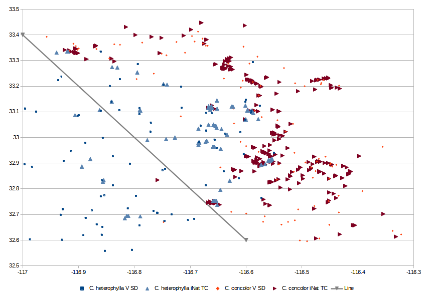- Julian area near (-116.6, 33.08), where both species were found at the same location, and previously placed in a single observation.