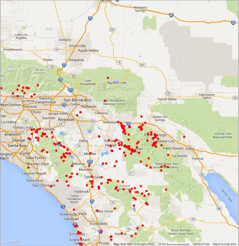 Fig. 2. The geographic range for E. crassifolium from vouchers is given by the red dots (the outliers are almost always misdetermined vouchers or badly-georeferenced vouchers). The range for the other two species is drawn by hand in this map, from the voucher maps for them (see a larger voucher map separately for E. crassifolium; for E. trichocalyx var. trichocalyx, and for E. trichocalyx var. lanatum).