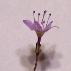If you observe no hairs at all, or hairs that do not appear cobwebby, then look at the flower from the side to determine whether the stamens and style are long-exserted or not, as in the picture to the right of G. caruifolia. (Long-exserted means those parts stick out well past the end of the flower lobes. Compare the stamens in the picture to the right with the short-exserted stamens and style in the pix of G. stellata immediately below.). If the stamens and style are long-exserted, you've identified G. caruifolia.