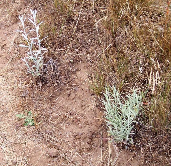 The white plant at upper left is ssp. microcephalum, and the greenish plant at lower right is ssp. beneolens. (The seedling plant at lower left is Hirschfeldia incana, shortpod mustard.)