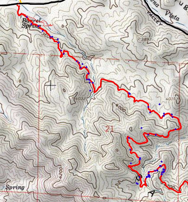 Fig. 2. Map of iNat observations (blue diamonds) I posted from a hike on the PCT south of S22 / Barrel Spring on 3 April 2020, and a GPS map of the trail (red line) made from a continuously-running Garmin GPS unit from one trip, and confirmed to the width of the red line from a number of other trips. Note that the trail is mostly on the east side of a fairly-steep ridge, with incursions into drainages where the satellite signals could be blocked from as much as half the sky. The points farthest from the trail are most often found near those drainages.