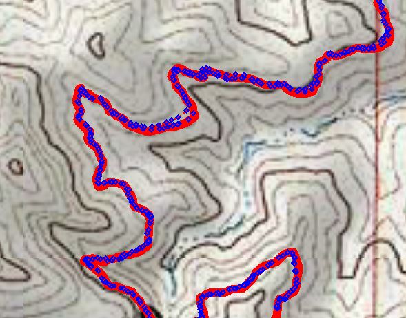 Note that seven of the observations are obviously quite far away from the trail (over 200 feet away) and another 14 or so are noticeably off the trail (over 80 feet away). In comparison, the track from my continuously-running Garmin on the same trip has every point from both the outgoing and ingoing track within the width of the red line that marks the trail, with one short exception where the outgoing and ingoing tracks are different by up to 100 feet for a very short distance.
