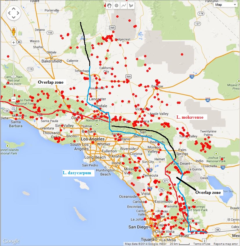 Fig. 2. Voucher locations for L. dasycarpum and L. mohavense (click on the name for a map showing only its vouchers). The black line gives a dividing line where the species ranges do not overlap. In the overlap areas, the range of L. dasycarpum is west of the blue line and the range of L. mohavense is east of the red line. Click on the map for a version showing a larger area that shows a much larger overlap zone in the western Tranverse Range area.