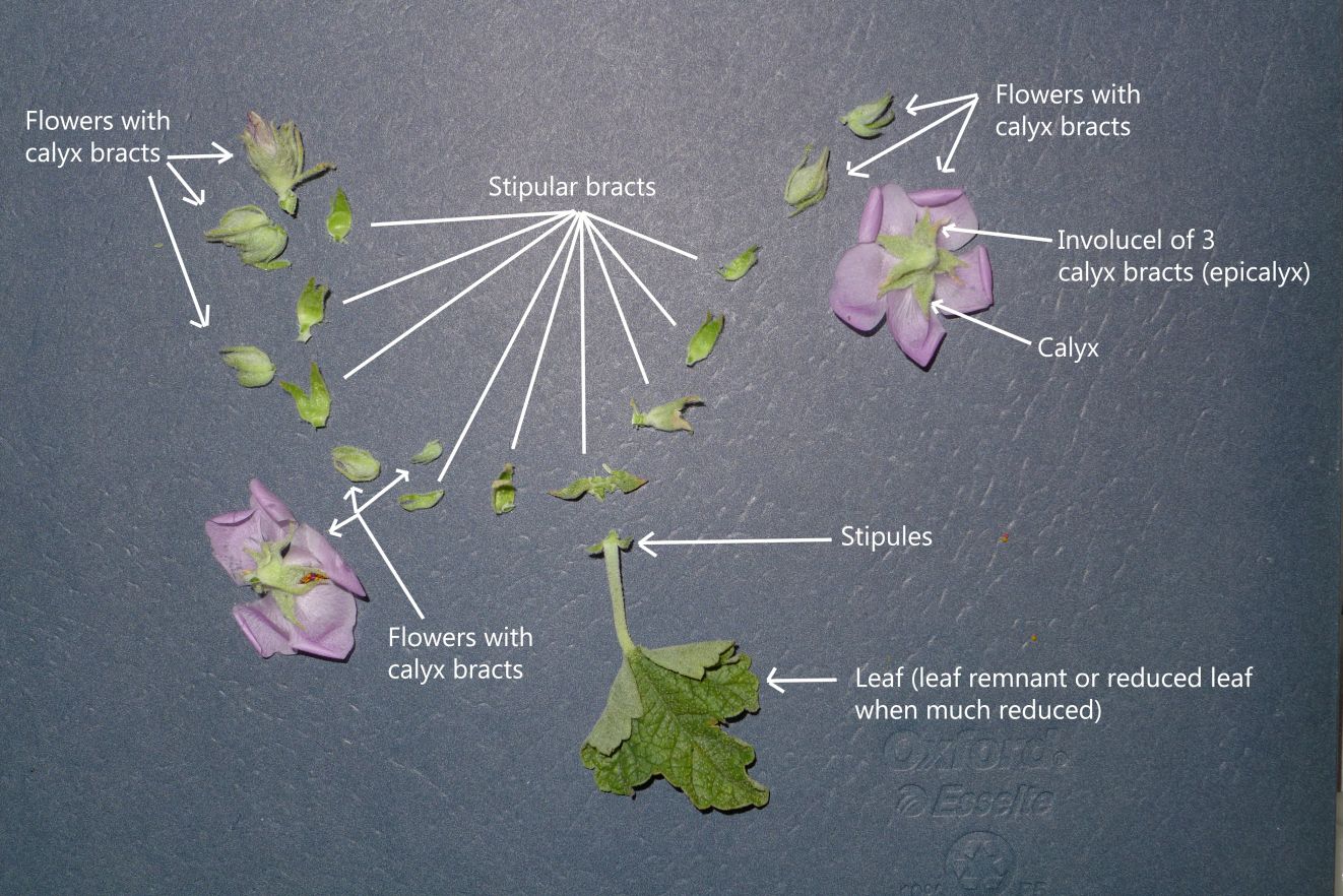 First, you have to learn the terminology of the different parts of the inflorescence glomerule, which is given in detail in our paper. The inflorescence of Malacothamnus is, frankly, a mess of confusing parts until you become quite familiar with the parts. Each glomerule of flowers (the dense collections of flowers with reduced branches at each node in the inflorescence) typically has 5 to 20 flowers in clusters of 1 to 5, with each flower cluster subtended by 1 to 5 stipular bracts, and each flower subtended by 3 calyx bracts (shown in Fig. 3).