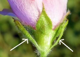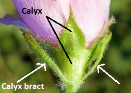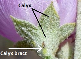 The calyx bracts are immediately outside the calyx, attached at the base of the calyx. They are a set of three usually-identical narrow structures with coloration similar to the calyx.
