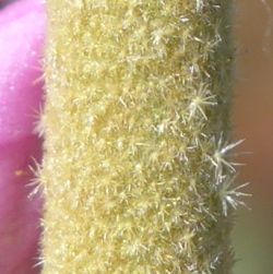- M. densiflorus is easily distinguished from the other two species by its green stems and calyces. In the other species, the underlying green color of their stems and calyces are obscured by their denser hairs. M. densiflorus is also distinguished from M. fasciculatus by its longer calyx bracts. It also frequently has longer calyx hairs than the other two species.