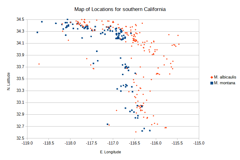 There are possibly other vouchers that should be re-checked, but none of them stand out as clearly as the three listed just above. In particular, the westernmost voucher determined as M. albicaulis, plotted at Warner Springs at (33.2842, -116.63113), and west of a voucher of M. montana, is a 1925 voucher from Jaeger which has a very uncertain location. ("Warner Springs" may just have been the closest named location.) Even if the location is actually at Warner Springs, that is a lower elevation location than the vouchers of M. montana to the east, so that voucher may well be correctly determined and georeferenced.