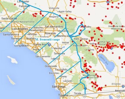- a finger of the M. fremontii distribution that reaches from Banning Pass to Yucca Valley, where both species are vouchered;