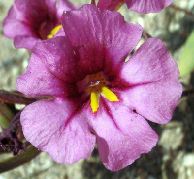 Fig. 5. Photographs of plants of Mimulus bigelovii from the same location, one flower showing obvious hairs on the corolla lobes (left); the other not showing any obvious hairs (right). Furthermore, although most plants of M. fremontii lack those hairs, some populations appear to have similar hairs. Although every picture I've taken of M. fremontii in southern California shows no hairs on the inner face of the corolla lobes, RT Hawke took a picture of a plant that shows similar long hairs on the inner face of its corolla lobes determined as M. fremontii by the Mimulus expert Naomi Fraga. RT's plant was from the southern end of the Sierra Nevada; it may just be that plants of M. fremontii are a bit different there. Other Calphotos pictures that may show similar hairs are one from "California" by Steve Schoenig and one from Kelso Creek Valley, Kern County, by Lara Hartley, also from the southern end of the Sierra Nevada.