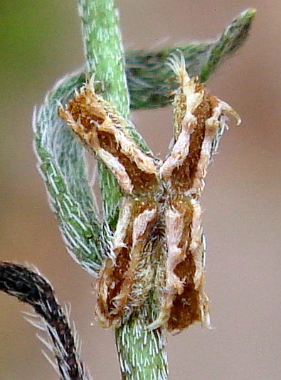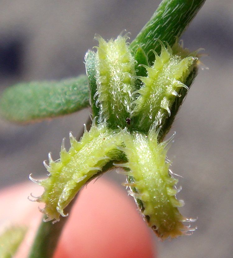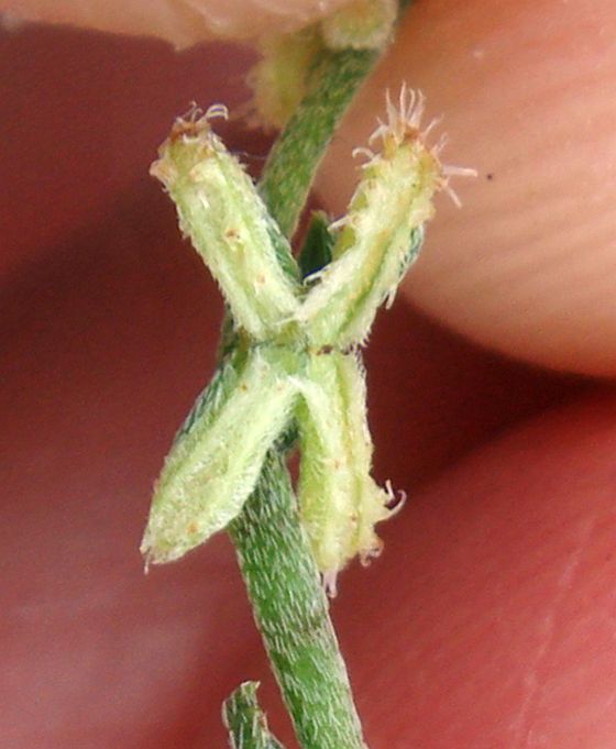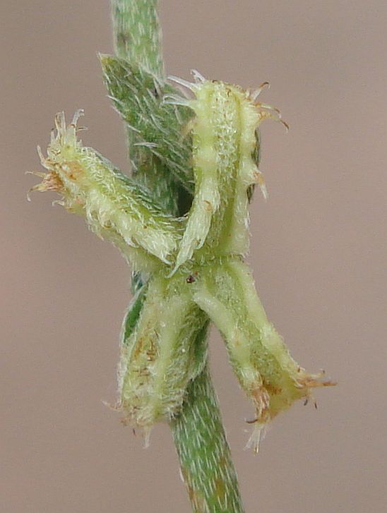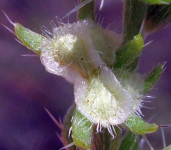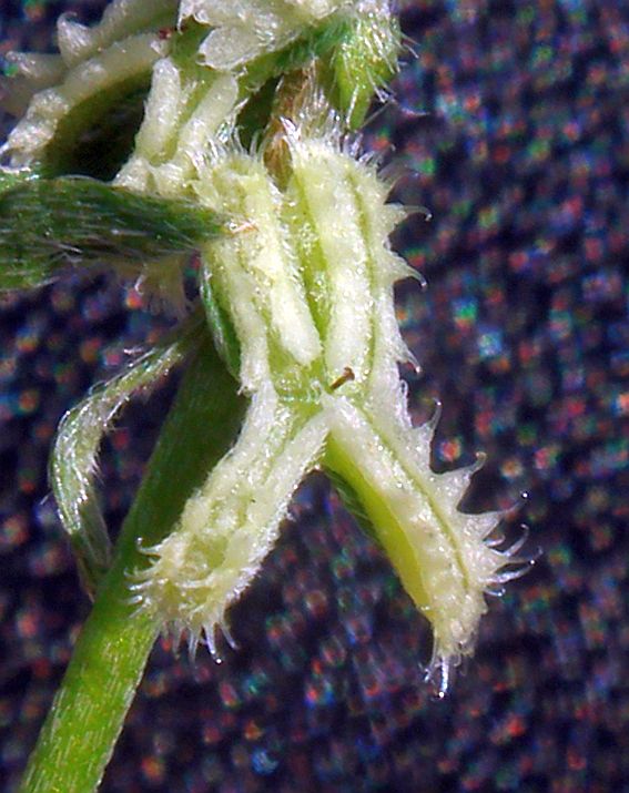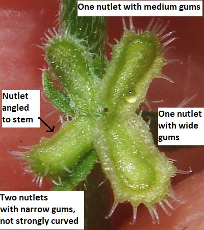 The nutlets of the other species are oblong, and presented downward at each node, with the calyx on top of the nutlets as seen from above, generally (but not always) on a prostrate or decumbent plant. The nutlets are little narrow rectangles in shape, generally with hooked transulent bristles along their edges. Each one of those nutlets looks similar to an animal jaw with teeth, usually with a "gum line" on top of the base of the nutlet, and "teeth" protruding from the "gum"; see Fig. 3.